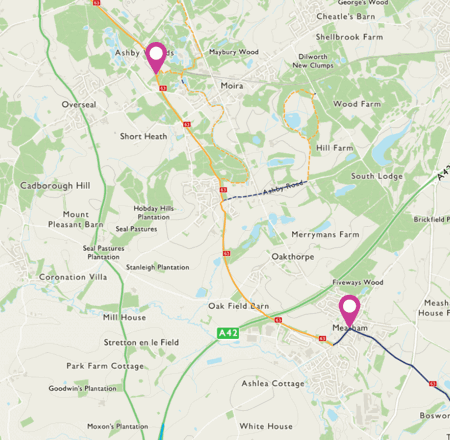 The route runs from Measham to Moira passing through countryside which is rich in social and industrial history. You will pass through old Donisthorpe Colliery site, now a Woodland Park, and there are links to the old mining village of Oakthorpe and Moira Furnace, thought to be the best-preserved 19th-century blast furnace in Europe. At Moira, you can visit Conkers, a forest-themed attraction with a wide variety of indoor and outdoor activities.