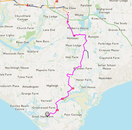 The route then continues on country lanes and clay track toward Pagham Harbour.