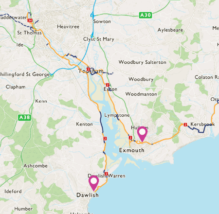 The route follows both sides of the River Exe Estuary, linking the seaside resort of Dawlish Warren to Exmouth.