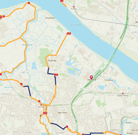 Following the River Darent where possible, this route links Temple Hill, the railway station, Dartford town centre, Central Park and Brooklands Lake with the River Thames.