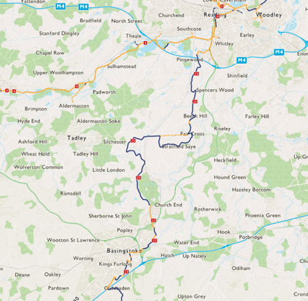 Locally known as the Calleva Trail and forming a key section of the National Cycle Network in Hampshire, the route follows traffic-free and on-road sections between Basingstoke Town Centre and Chineham, and then follows quiet lanes passing Silchester and then through West Berkshire and on to Reading. Due to development in the area, these roads are busier than they used to be.