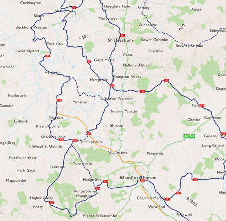 This route surrounds Route 25 much like a figure of 8, meeting at Gillingham, near Iwerne Minster, and Blandford Forum. The route is a continuous loop except for at Blandford Forum where it breaks at Blandford Bridge to the south-west of the town.
