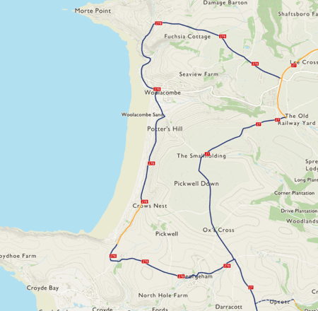 The route then travels north past Putsborough and along the coast (Morte Bay) to Woolacombe. At Mortehoe the route turns east and continues back to meet Route 27.