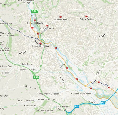 Starting from Exeter St David’s station the route crosses the River Exe via a bridge on Station Road and then turns south to follow paths alongside the River Exe and then Exeter Canal. The route travels through the Riverside Valley Park and links with National Route 2 at Bridge Road. National Route 2 continues on the Exeter Canal all the way to Exminster.
