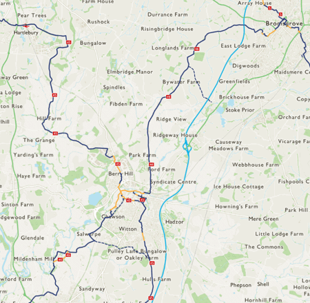 The route begins at Bromsgrove and travels on-road to Droitwich Spa. After a short traffic-free stretch the route continues on-road Worcester: this section is around 10 miles and relatively flat and follows a similar line to the Droitwich Canal, taking you to Worcester's racecourse.