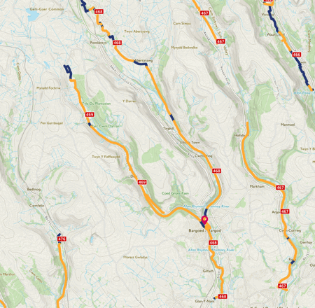 Please note that there is a gap in the route between Abertysswg and New Tredegar.