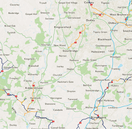 The next open section is between Stourbridge and Dudley from where the only current open route is to follow National Route 81 to Sandwell and then National Route 5 to Creswell Green.