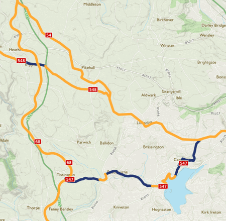 This route links west to east across all three major National Routes in the area from the High Peak Trail, crossing the Tissington Trail and meeting National Route 549 at Hartington in the Peak District National Park.
