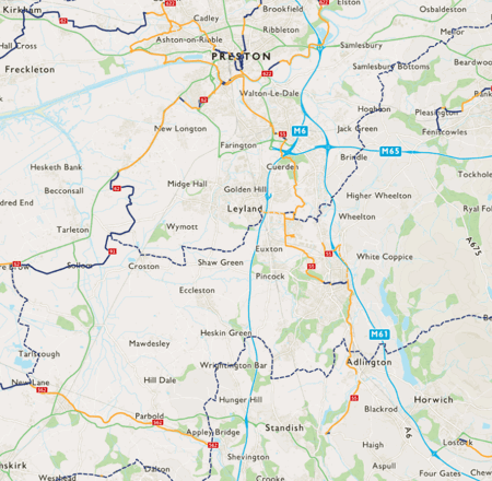 Route 55 runs in sections between Ironbridge and Preston via Telford, Newport, Stafford, Macclesfield, Stockport and Wigan or Bolton. Between Stafford and Stoke-on-Trent the route follows Route 5.