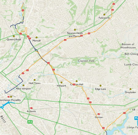 The route takes in most of the Fallowfield Loop between Chorlton-cum-Hardy and Gorton before heading north along the filled-in Stockport Branch Canal and sections of towpath along the Ashton Canal.