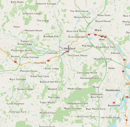 Route 61 starts near Maidenhead and follows the Jubilee River until the edge of London, near Uxbridge, where it follows the same route as Route 6 until St Albans. Here the two routes split and Route 61 continues east along the Alban Way to Hatfield, Welwyn Garden City and Hertford before turning south into the Lee Valley, where it joins Route 1 near Hoddesdon.