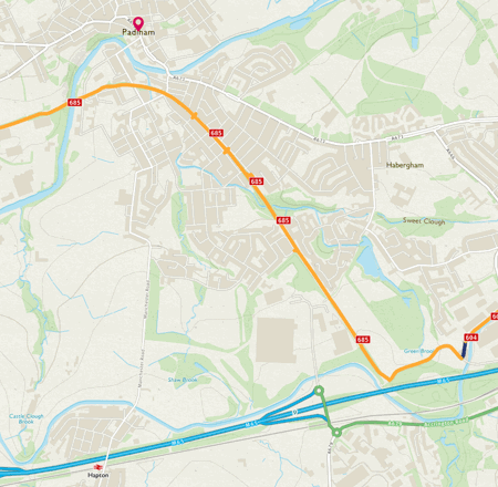 - Diversion 1, following Park Road, Station Road, A671 (Burnley Road, Church St), Blackburn Road (A678), Bridge Street and Padiham Memorial Park. The route is suitable for all users via on-road cycling or pedestrian footways.