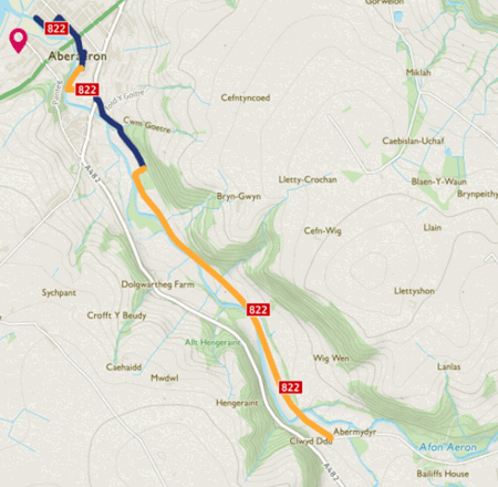 Route 822 is still under development and much of it is only proposed. Currently only the section between Aberaeron and the National Trust property at Llanerchaeron along an old railway path is open.