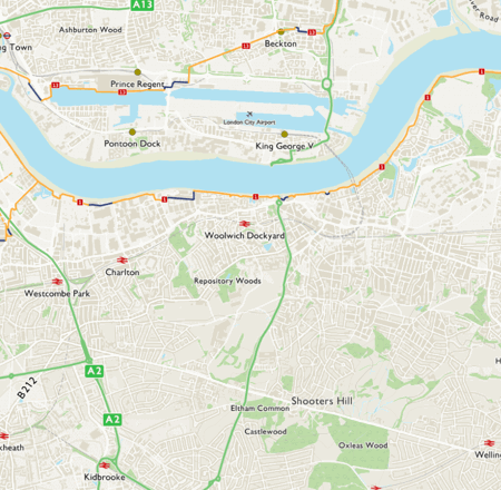 By river: Greenwich, North Greenwich and Woolwich (Royal Arsenal). Woolwich Ferry from Woolwich Ferry South Terminal (free).