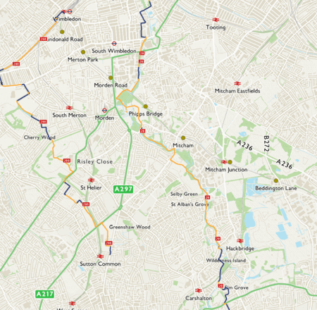 Take a short hop west to join Route 208 between Wimbledon and Sutton Common.