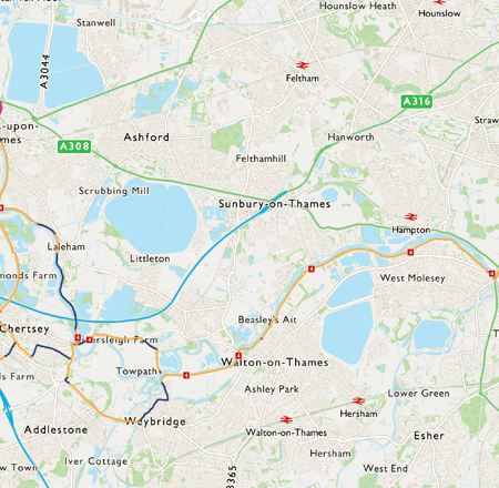 From Chertsey Lock follow Thames Side under the M3 and alongside Laleham Park (good spot for a picnic). Laleham House, the family seat of Lord Lucan is behind the trees on your right…bonus points if you spot him! Pass Laleham campsite and continue. The way branches at several points - always adhere to the river. Soon you will arrive at Penton Hook Lock where there are toilets. There follows a residential stretch of river with very pleasant views. Continuing on the path will shortly bring you to a railway bridge. Go under the bridge on to a short section of cycle path by the A308. Pass Thames Lodge and then turn left to take you into a landscaped area by the river which you can then explore. There is a good choice of refreshments by the waterside and in the town.