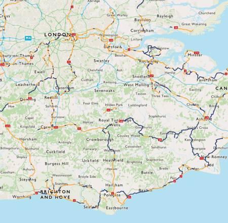 In the UK, the route mainly follows Route 4, Route 20, Route 21 and Route 2 as it passes through London, Surrey, West Sussex and East Sussex.