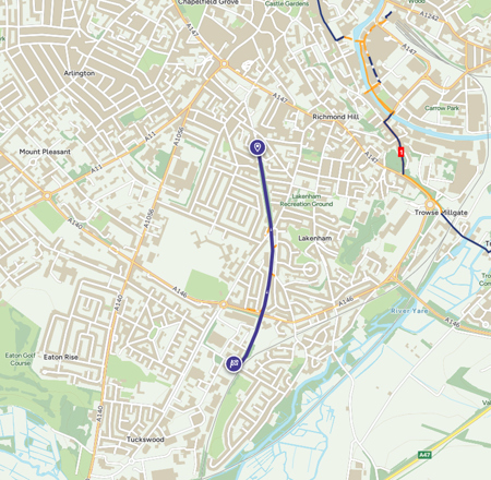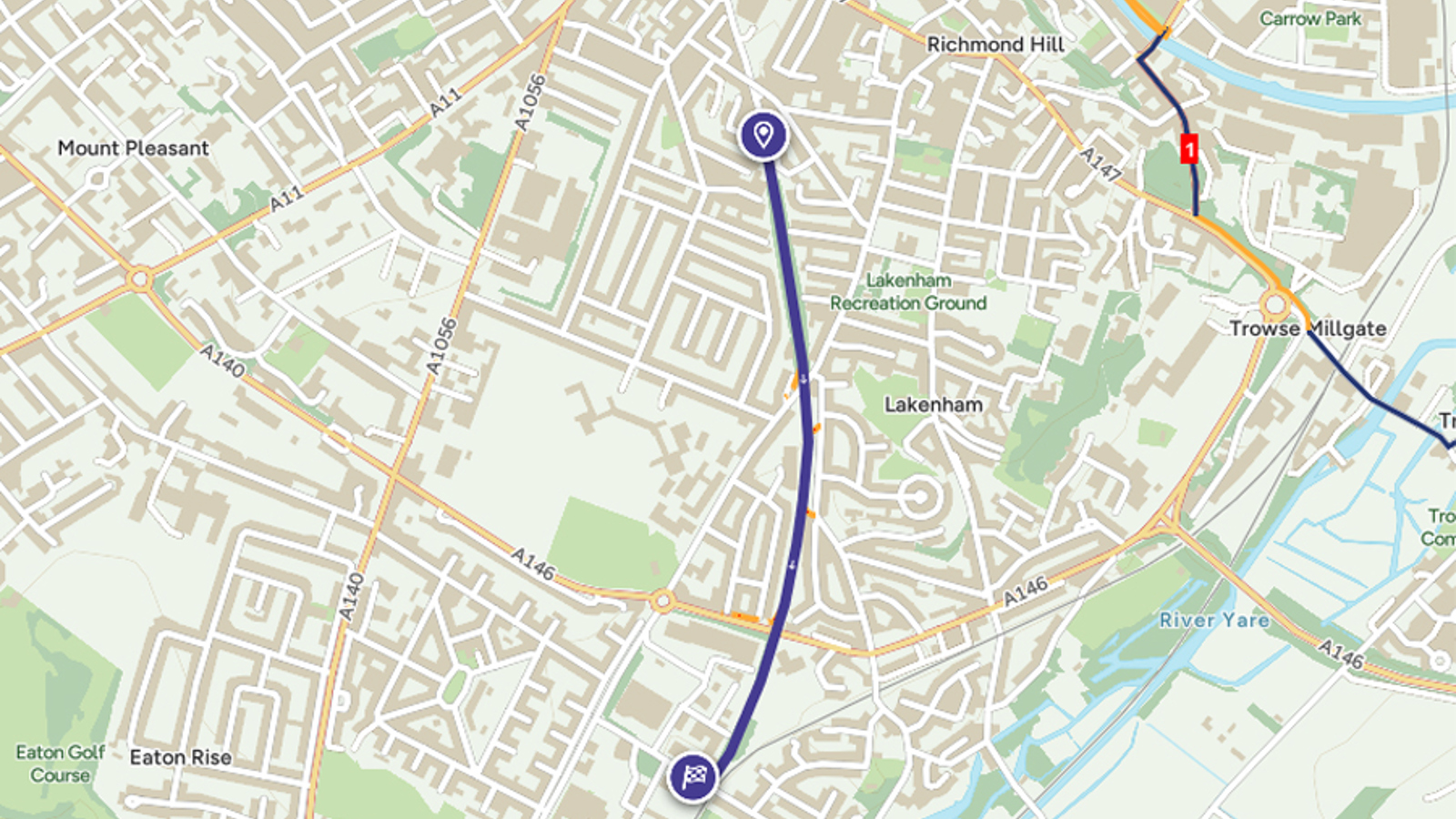 - End Point: Sandy Lane, the southern edge of Lakenham, near Tuckswood.