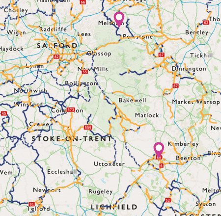 The first (or last) stage of the route is between Derby and Holmfirth and is known as the Pennine Cycleway - Peak District.