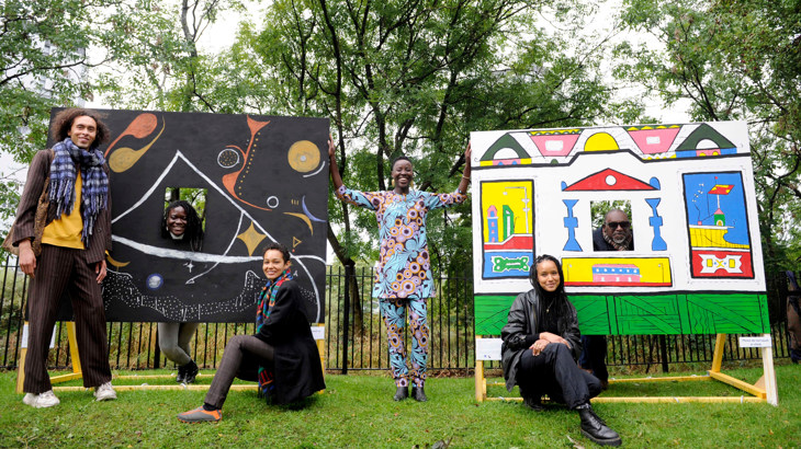 Artists (L-R) Jim Muotune, Senanu Tordzro, Grace Browne, Harvey Dimond, Moira Salt and Becky Sikasa launch the programme of art and events at Grace's mural triptych, Glasgow Green.