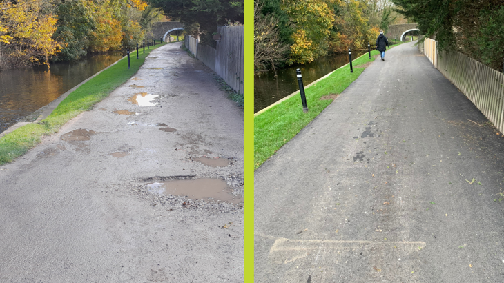 A before (left) and after (right) of a section of path resurfaced with asphalt before the tar spray and chip is laid in spring 2025. Credit: Canal & River Trust, 2024.