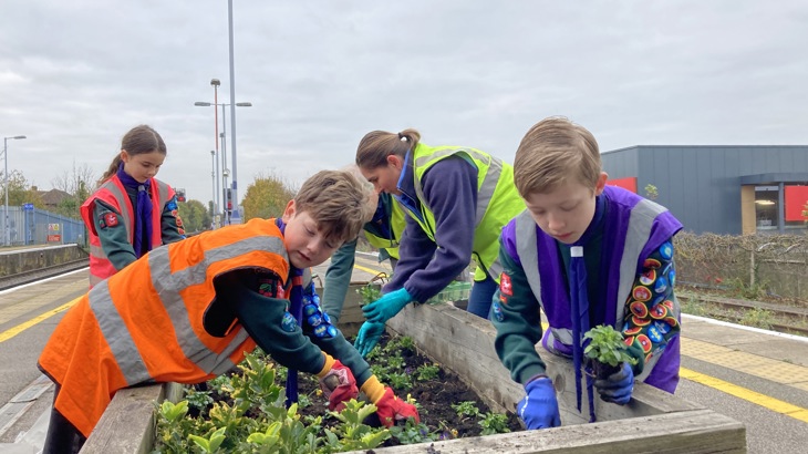 Sittingbourne Cub Scouts planting at a Kent Community Rail Station. Credit: Walk Wheel Cycle Trust, 2024.