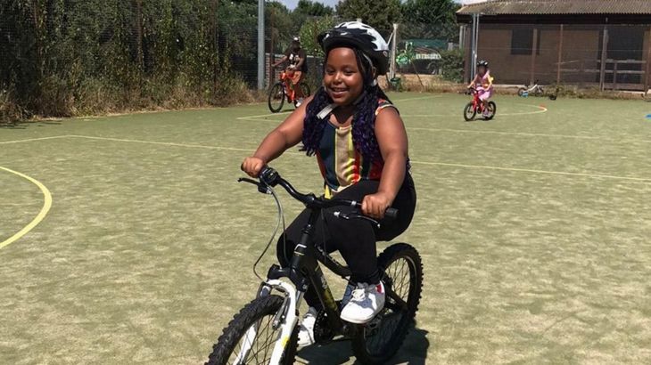 Lizette learning to cycle during the school holiday programme. Credit: Walk Wheel Cycle Trust